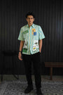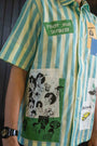 The green and blue stripes are punctuated with original patch artworks —loud in just the right places.